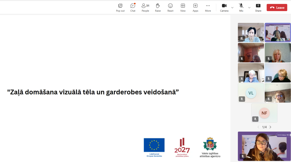 Rīgas Stila modes tehnikums 2025. gada 02.oktobrī sadarbībā ar VIAA Eiropas Sociālā fonda Plus projekta Nr. 4.2.2.3/1/24/I/001 “Pedagogu profesionālā atbalsta sistēmas izveide” ietvaros īstenoja pedagogu profesionālās kompetences pilnveides programmu Zaļā domāšana vizuālā tēla un garderobes veidošanā, 6.st., stilistes Valērijas Savčenko vadībā, iesaistot astoņas Latvijas profesionālo izglītības iestāžu pedagogus, kas ikdienā strādā ar izglītojamajiem, kas apgūst dažādas kvalifikācijas Tērpu izgatavošanas un stila speciālists, Tērpu modelēšanas un konstruēšanas speciālists, Vizuālā tēla stilists, Frizieris-stilists, Apģērbu dizaina asistents.